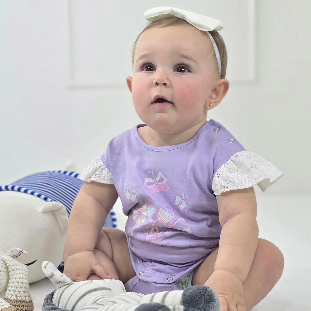 BODY DE JERSEY ESTAMPADO CON VUELO EN BRODERIE. SUAVE Y CÓMODO PARA TODOS LOS DÍAS. COLORES CRUDO Y LAVANDA. PARA BEBA, DEL TALLE XS AL XL. LA MODELO TIENE 9 MESES Y USA TALLE L.