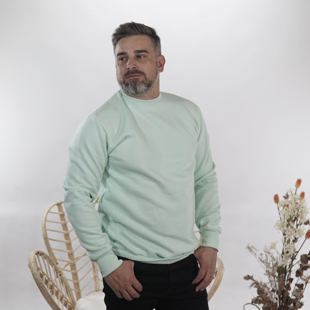 BUZO BÁSICO DE FRISA PEINADA CON ESCOTE REDONDO. MORLEY EN CUELLO, PUÑOS Y CINTURA. SUAVE, ABRIGADO Y EN COLORES CLÁSICOS. TALLES DEL 3XS AL 5XL. EL MODELO USA TALLE M, MIDE 1,80 M Y PESA 75 KG APROX.