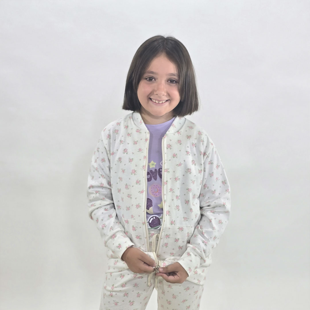 CAMPERA TIPO BOMBER CONFECCIONADA EN RÚSTICO. CUELLO, PUÑOS Y CINTURA CON COMPLEMENTO DE MORLEY. ESTAMPAS DELICADAS QUE ACOMPAÑAN CUALQUIER LOOK. LA MODELO MIDE 1,10 M Y PESA 26 KG APROX.