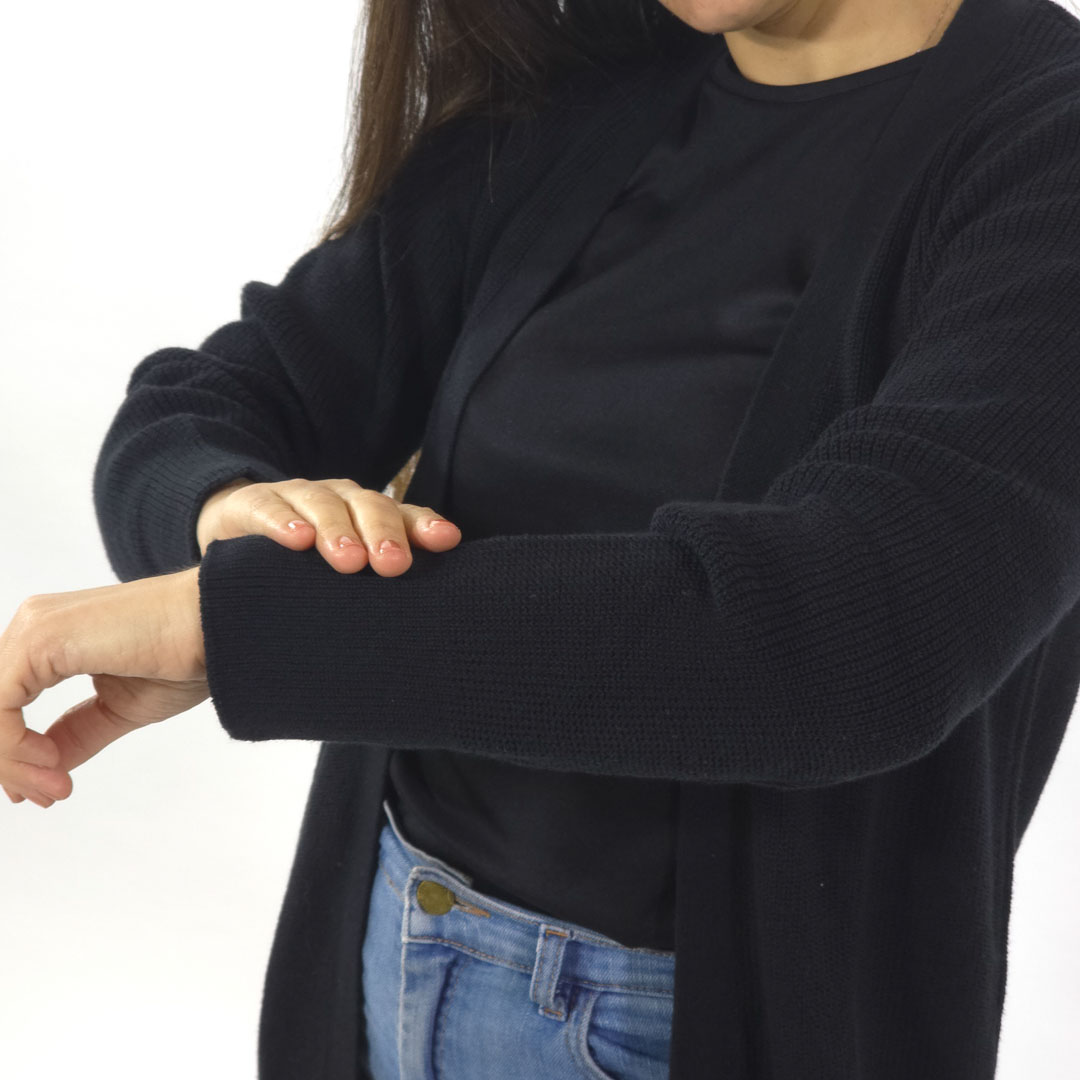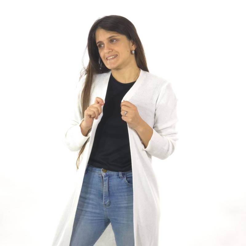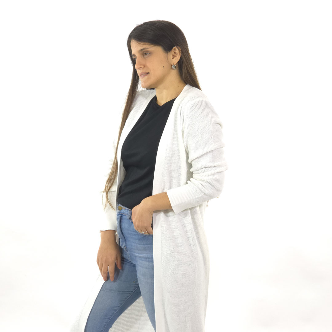 CARDIGAN LARGO DE HILO TEJIDO, DE CALCE AMPLIO Y CÓMODO. IDEAL PARA MEDIA ESTACIÓN O SUPERPONER. DISPONIBLE EN TALLES S A M. LA MODELO USA TALLE M, MIDE 1,70?M Y PESA 62?KG APROX