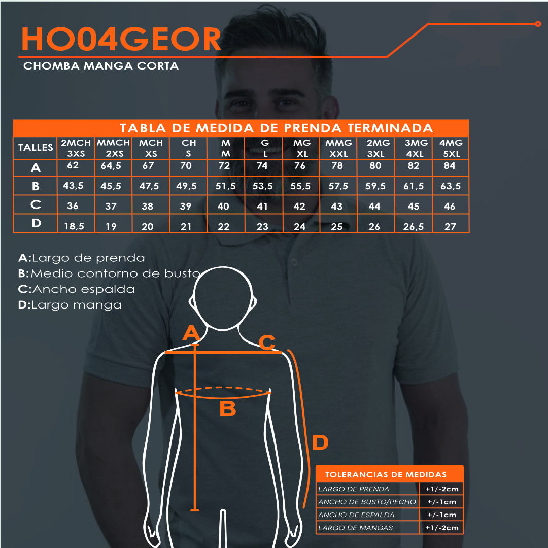 CHOMBA DE MICROPIQUÉ 50% ALGODÓN Y 50% POLIÉSTER, MANGA CORTA, CARTERA DE DOS BOTONES, PUÑOS AL TONO Y CUELLO TEJIDO. CALCE CÓMODO Y VERSÁTIL. TALLES DEL 3XS AL 5XL. EL MODELO USA TALLE M, MIDE 1,80 M Y PESA 75 KG APROX.
