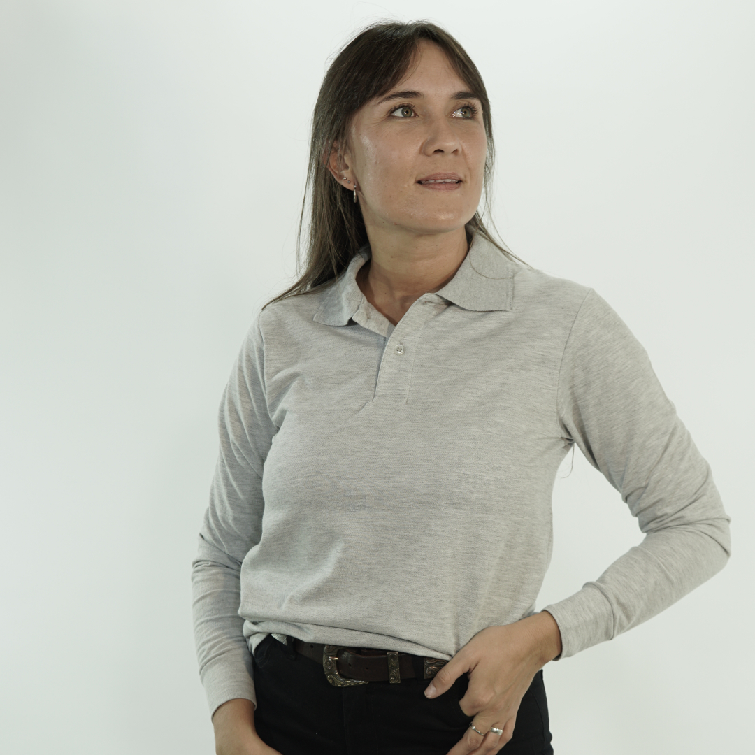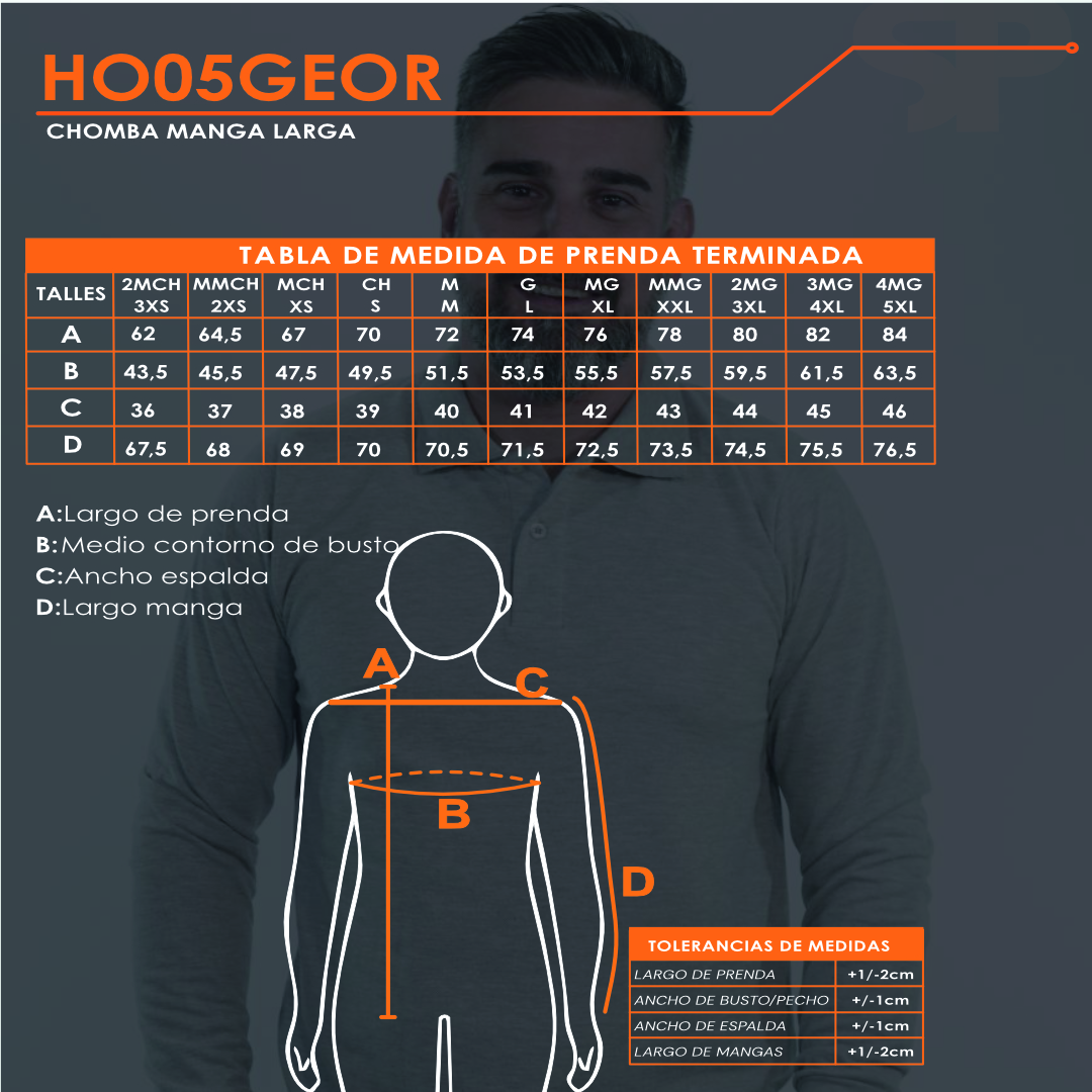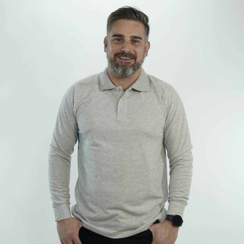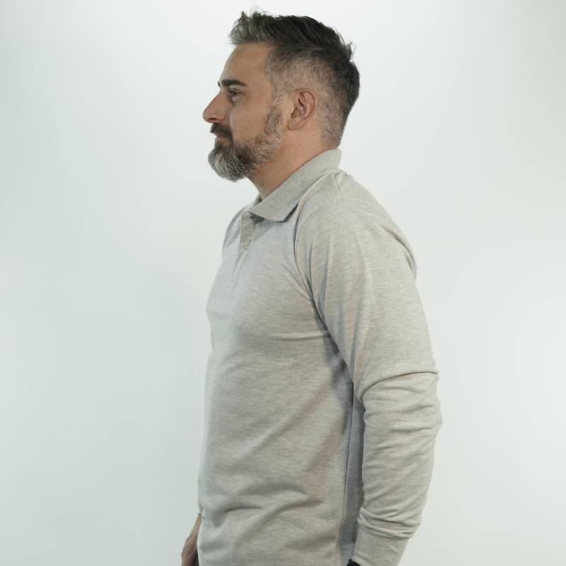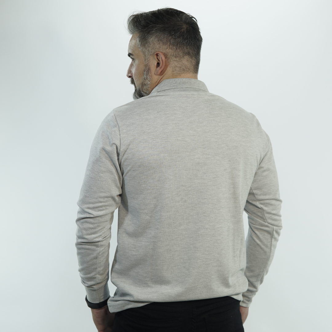 CHOMBA DE MICROPIQUÉ 50% ALGODÓN Y 50% POLIÉSTER, MANGA LARGA, CARTERA DE DOS BOTONES, PUÑOS AL TONO Y CUELLO TEJIDO. CALCE CÓMODO Y VERSÁTIL. TALLES DEL 3XS AL 5XL. EL MODELO USA TALLE M, MIDE 1,80 M Y PESA 75 KG APROX.