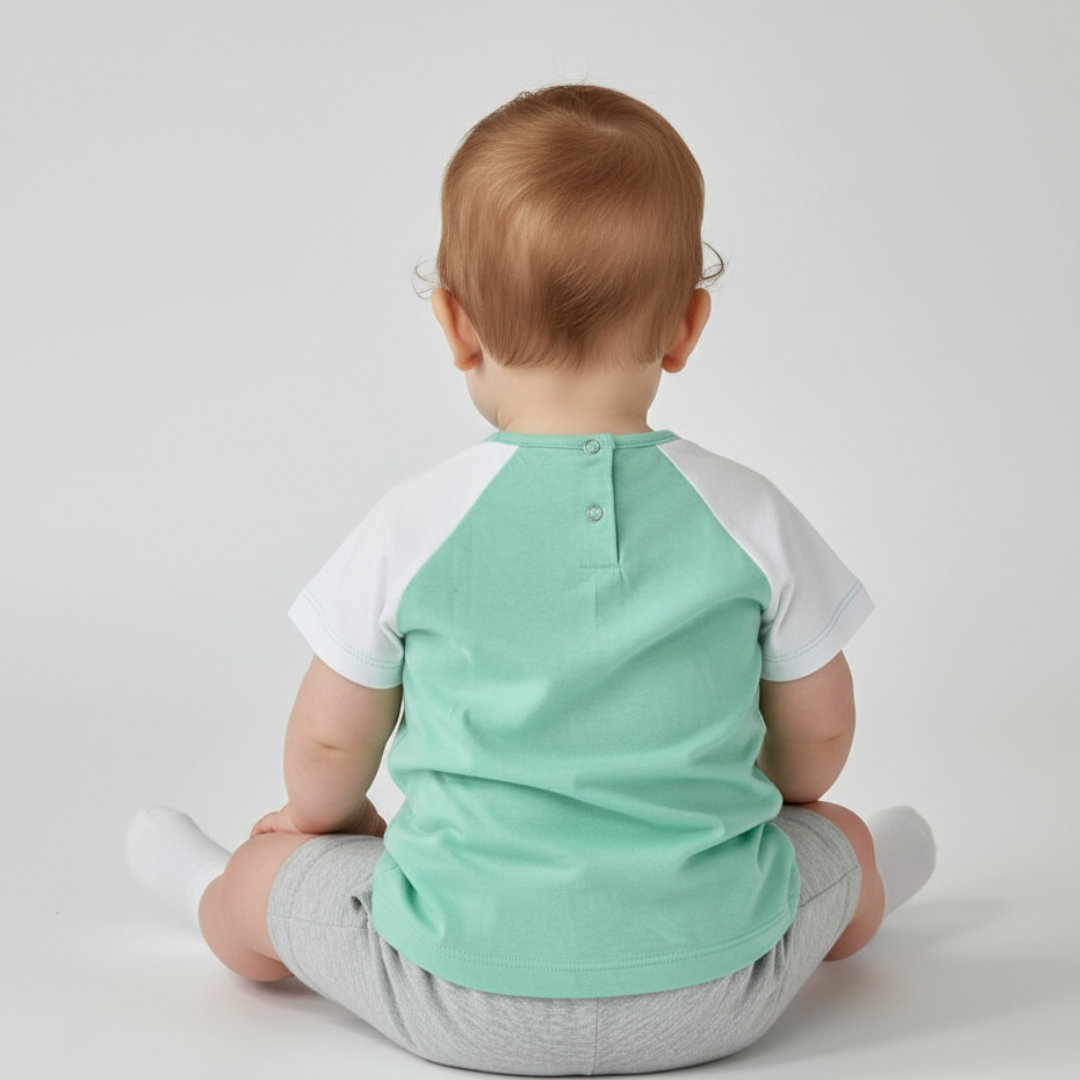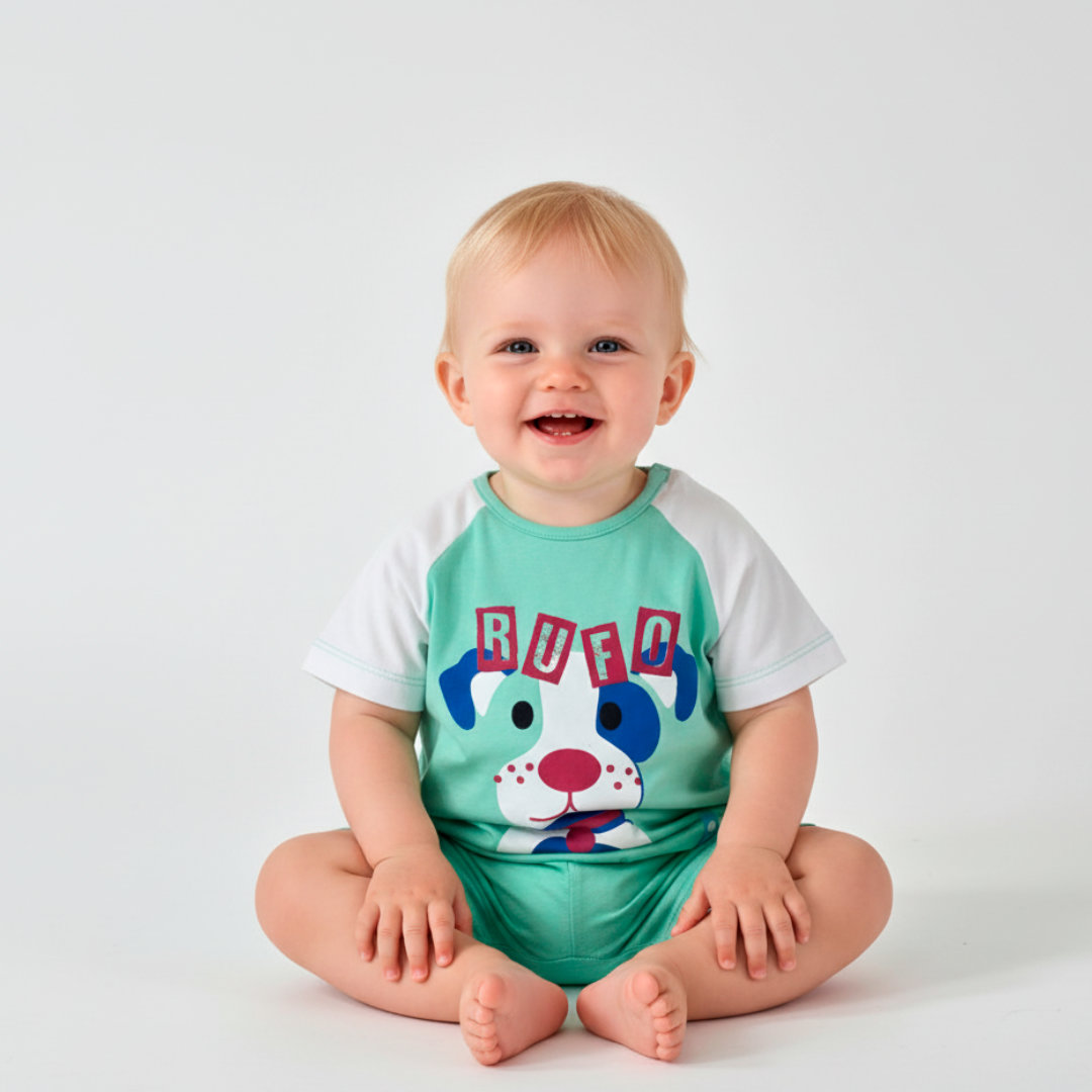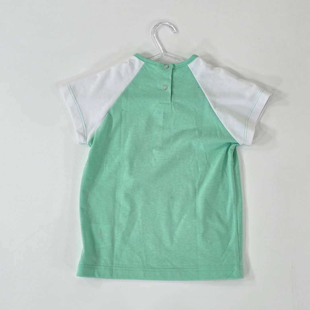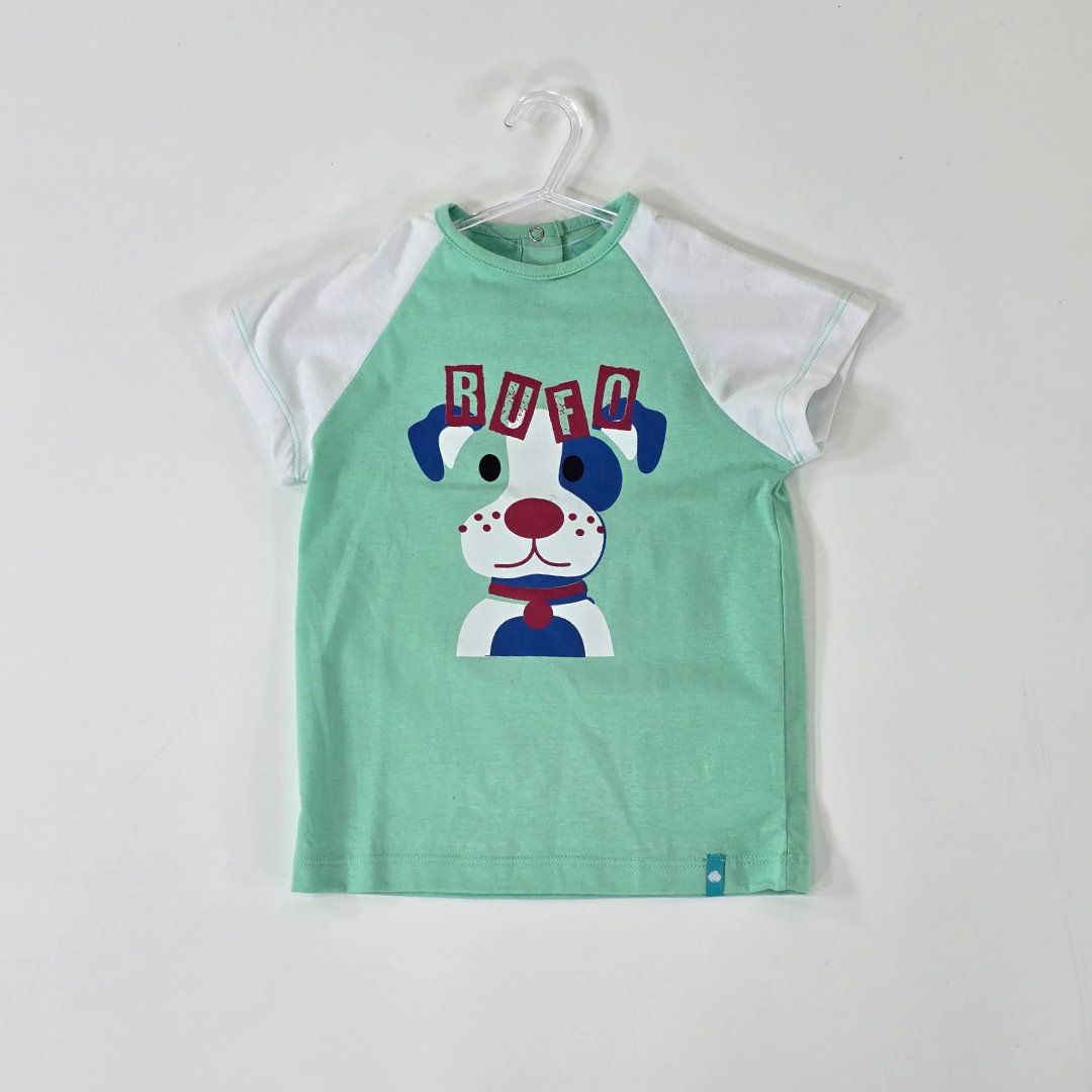 REMERA RUFO EST 100% ALGODÓN COLOR VERDE MENTA Y BLANCO ESTAMPADA, CON BOTONES EN LA PARTE POSTERIOR. CALCE CÓMODO, TEXTURA SUAVE Y LIVIANA. IDEAL PARA USO DIARIO. TALLES DEL 1 AL 4. MODELO USA TALLE 2 Y TIENE 2 AÑOS.