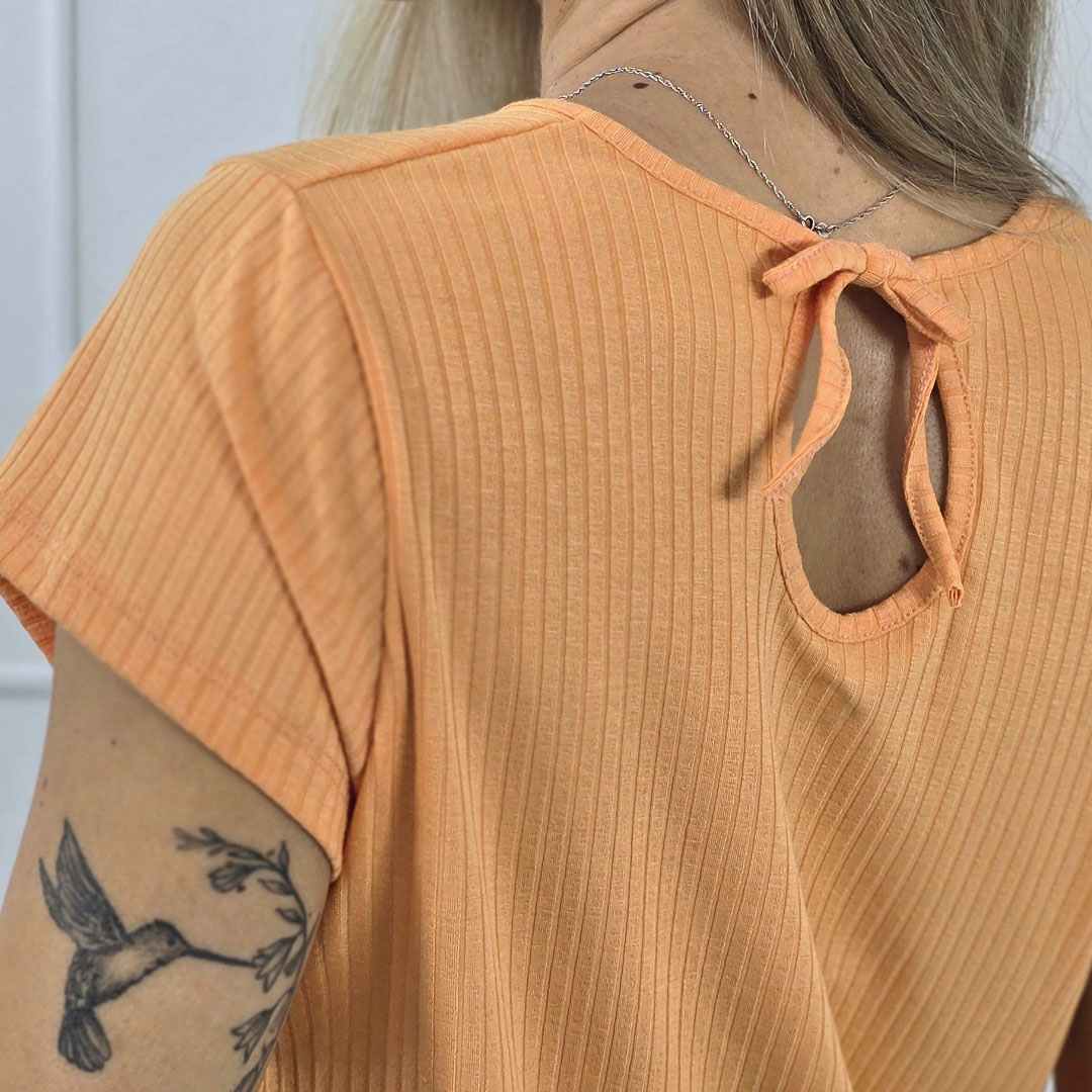 REMERA MANGA CORTA DE CALCE HOLGADO, CON DETALLE DE GOTA Y CORDÓN EN LA ESPALDA. CONFECCIONADA EN MORLEY VISCOSA SUAVE. TALLES DEL S AL 3XL. LA MODELO MIDE 1,65?M Y USA TALLE M. CÓMODA, FRESCA E IDEAL PARA UN LOOK RELAJADO Y FEMENINO.