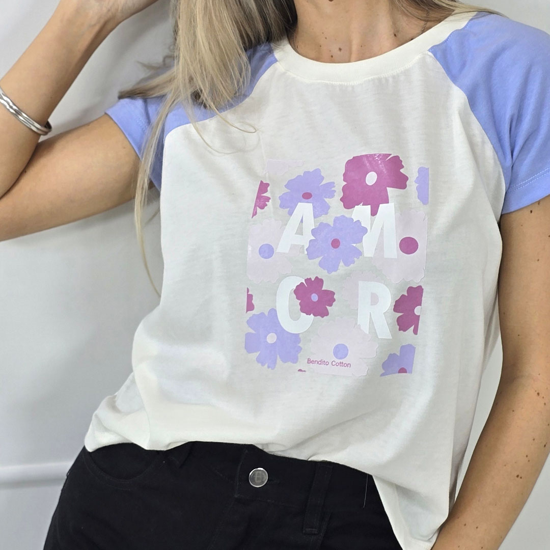 REMERA MANGA CORTA RANGLAN CON COMBINACIÓN DE COLORES EN LAS MANGAS Y ESTAMPAS DELICADAS. DE CORTE RECTO, CÓMODA E IDEAL PARA TODOS LOS DÍAS. TALLES DEL S AL 3XL. LA MODELO MIDE 1,65?M Y USA TALLE M.