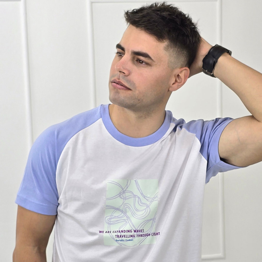REMERA RANGLAN DE MANGA CORTA CON MANGAS COMBINADAS Y ESTAMPAS ORIGINALES Y COLORIDAS. CONFECCIONADA EN JERSEY DE ALGODÓN. TALLES DEL S AL 4XL. EL MODELO MIDE 1,75?M Y USA TALLE M.