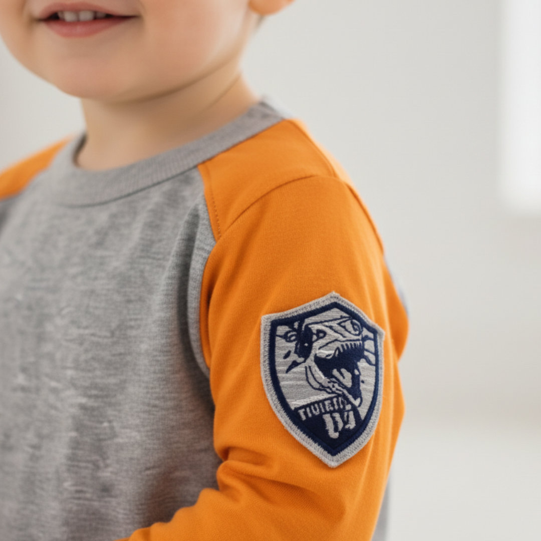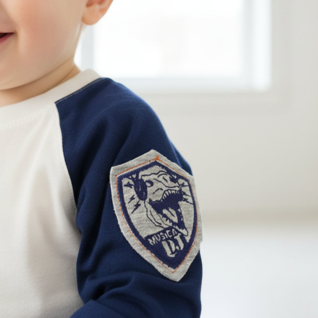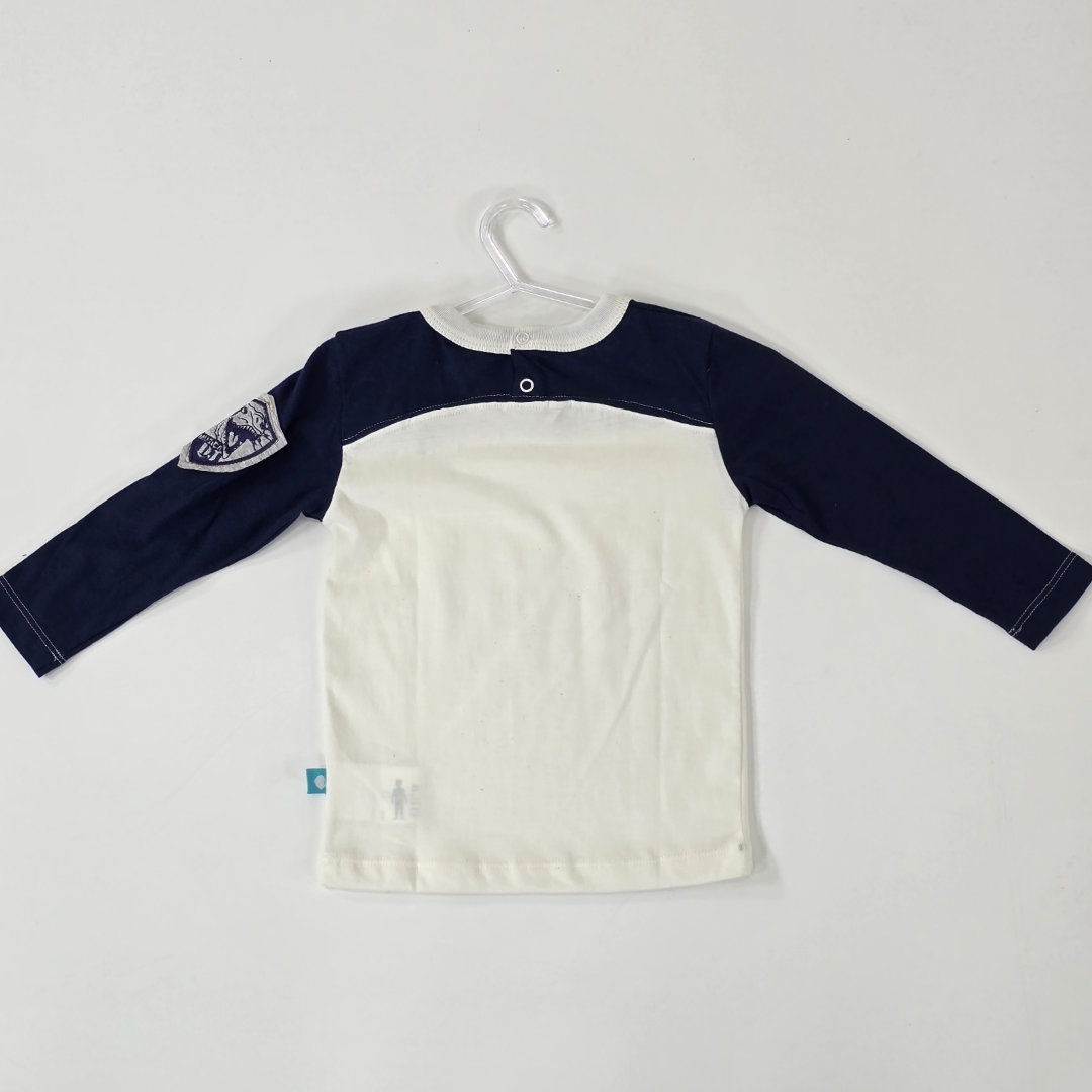 REMERA TEO DE JERSEY 100% ALGODÓN COLOR CRUDO CON APLIQUE. CALCE CÓMODO, TEXTURA SUAVE Y LIVIANA. IDEAL PARA USO DIARIO. TALLES DEL 1 AL 4. MODELO USA TALLE 1 Y TIENE 1 AÑO.