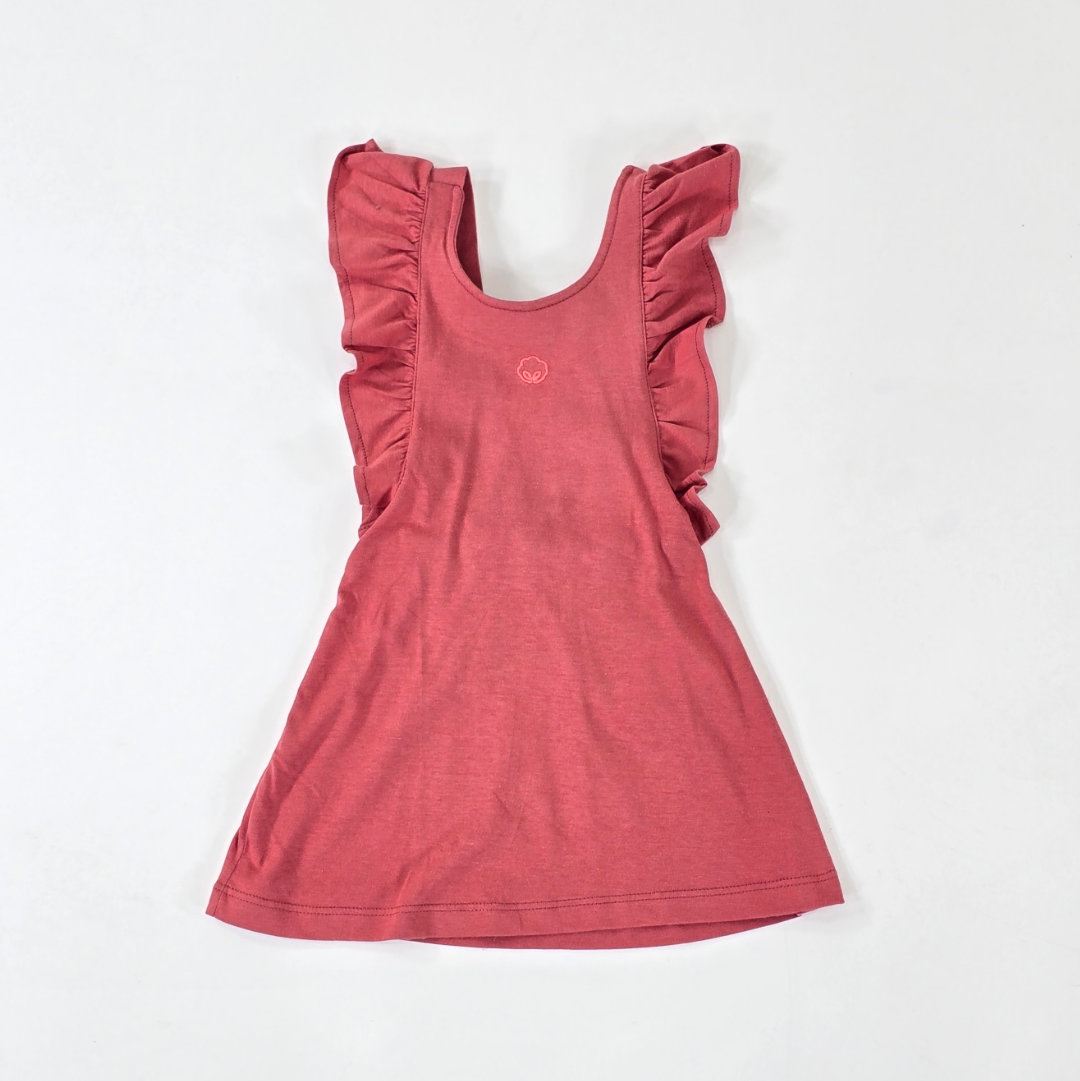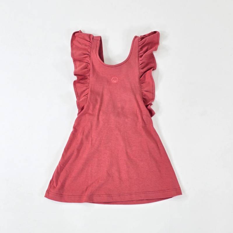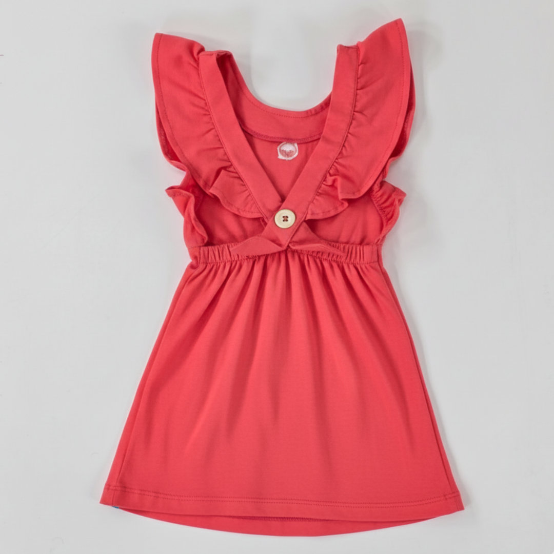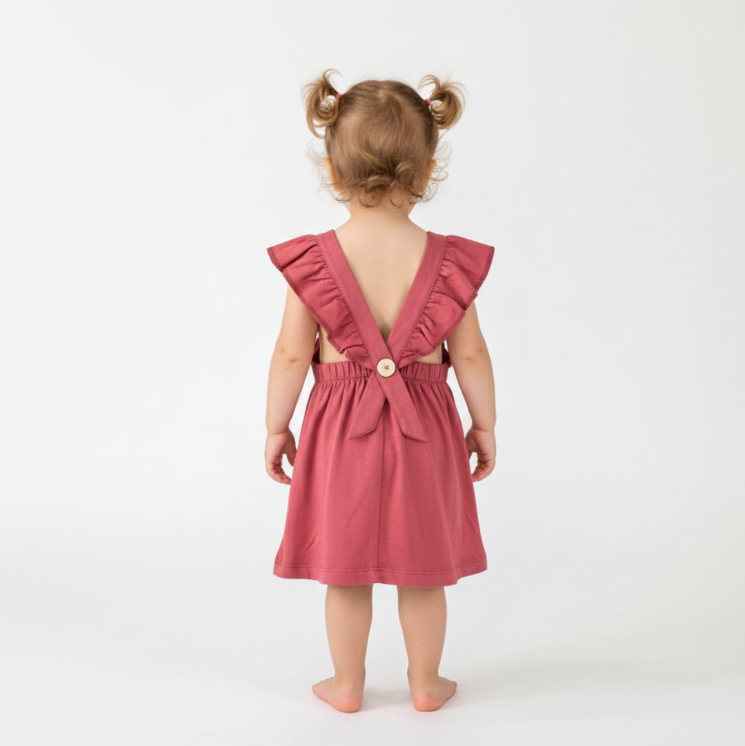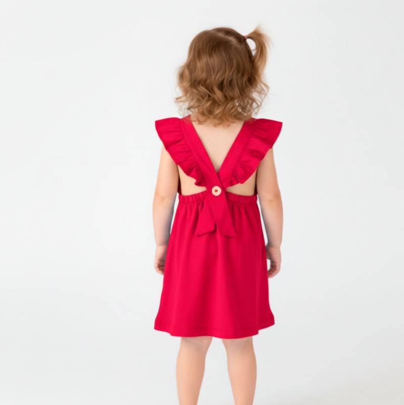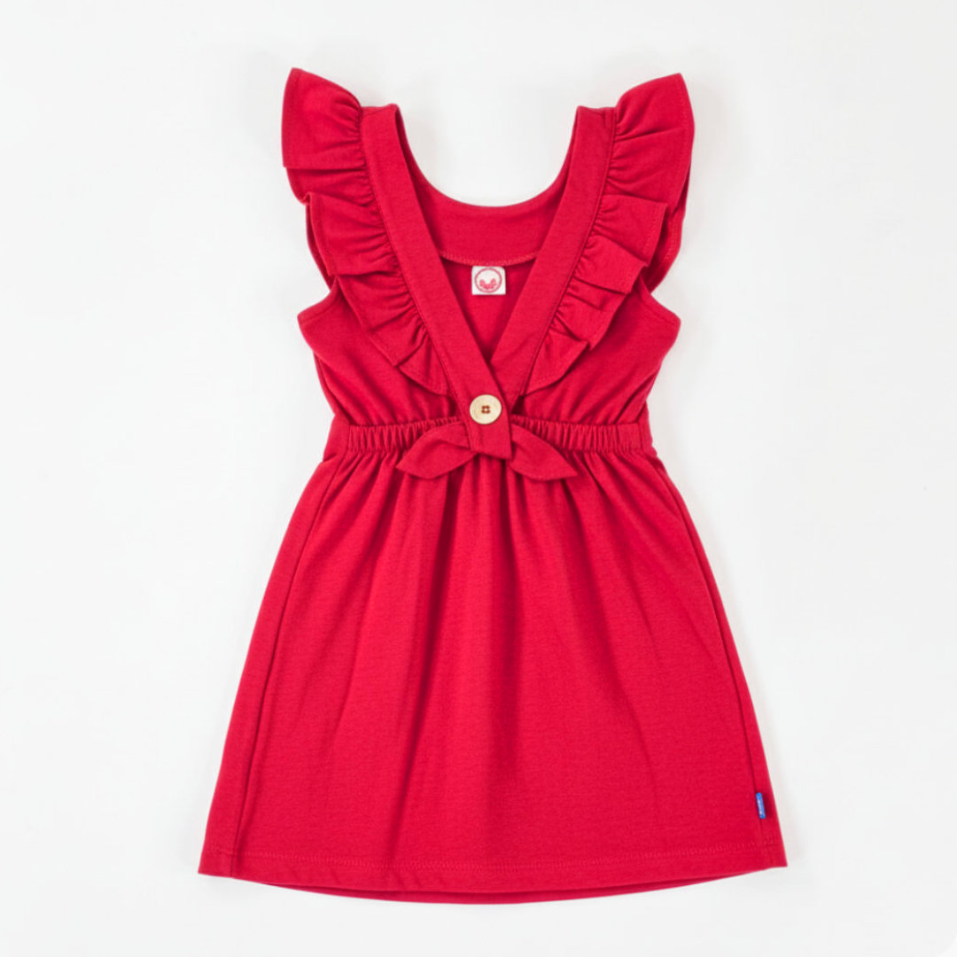 VESTIDO SIN MANGAS CON ESPALDA CRUZADA, VUELOS Y BOTÓN COMO DETALLE. ELÁSTICO EN LA PARTE TRASERA PARA MAYOR COMODIDAD. COLORES: BORDÓ MELANGE Y VERDE MENTA MELANGE. TALLES DEL 1 AL 4. LA MODELO TIENE 2 AÑOS Y USA TALLE 3
