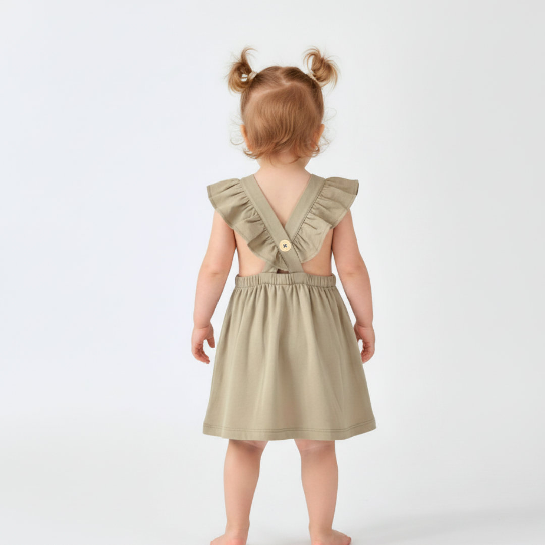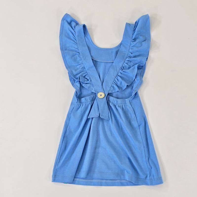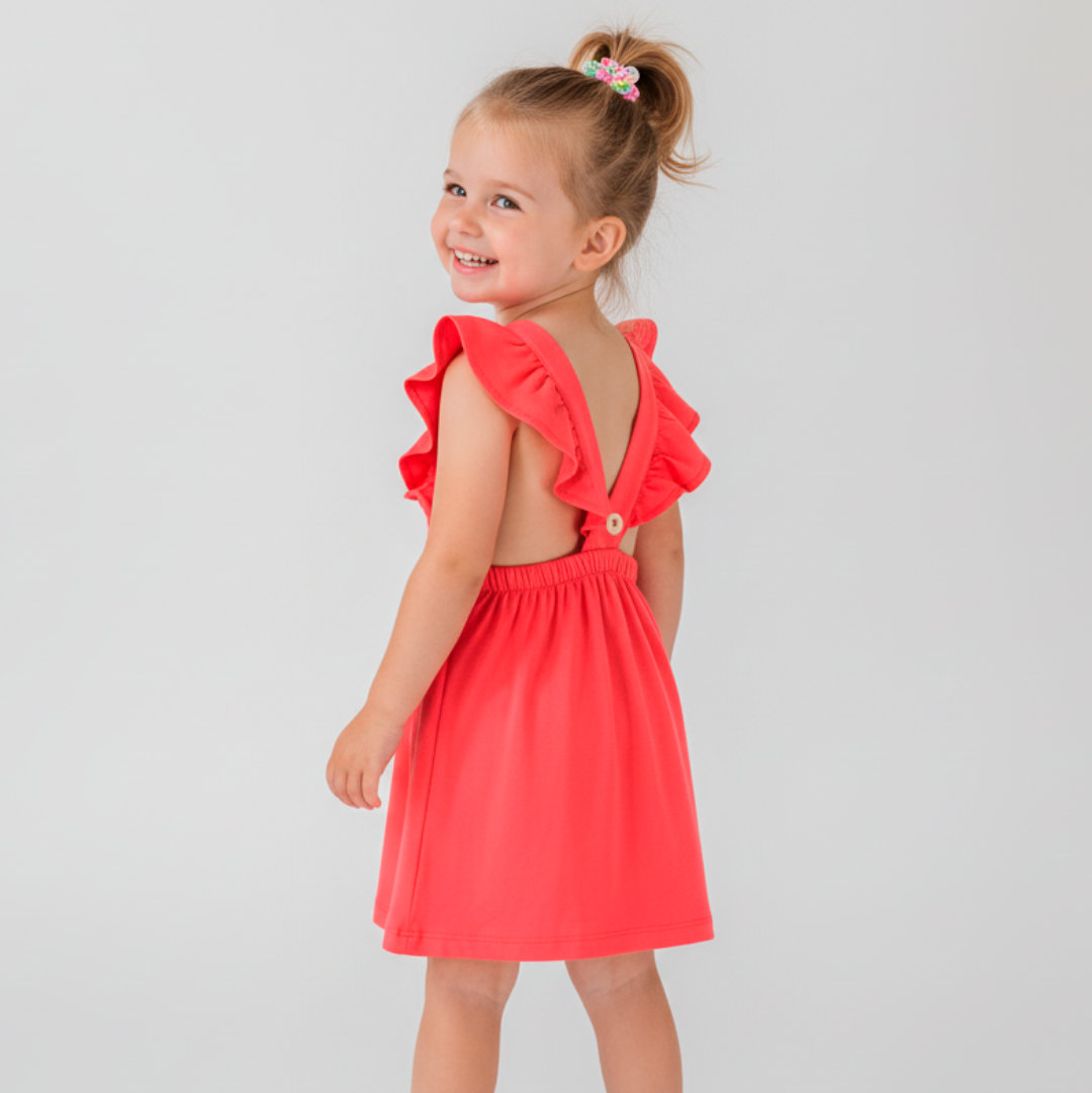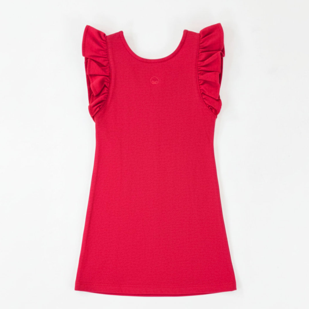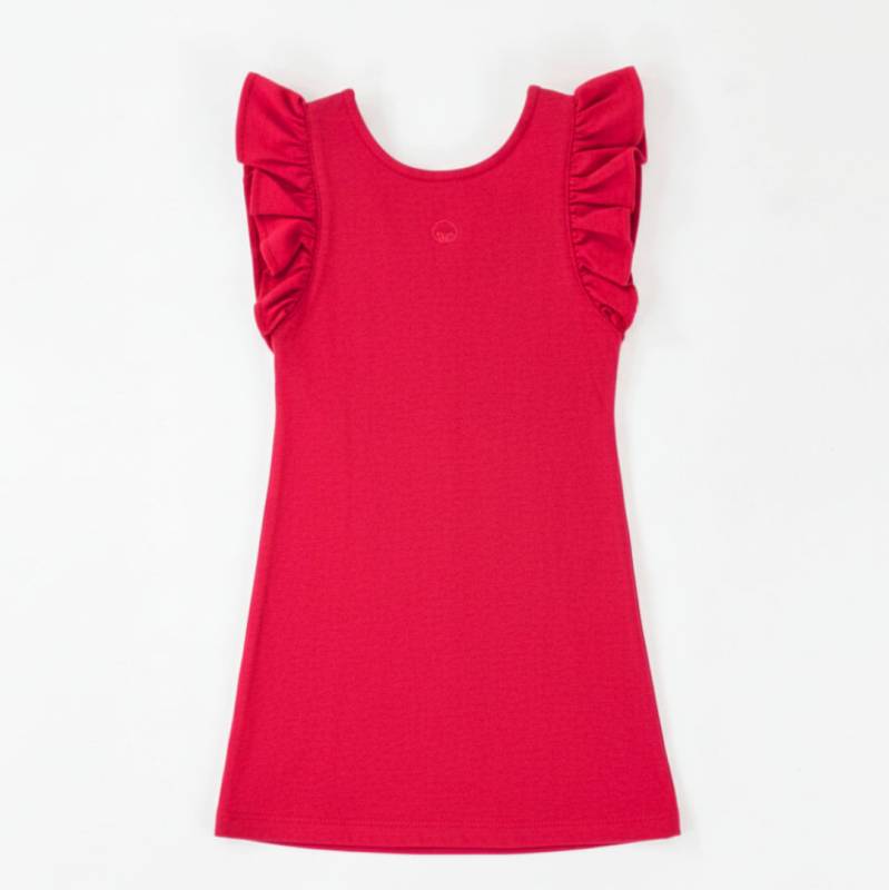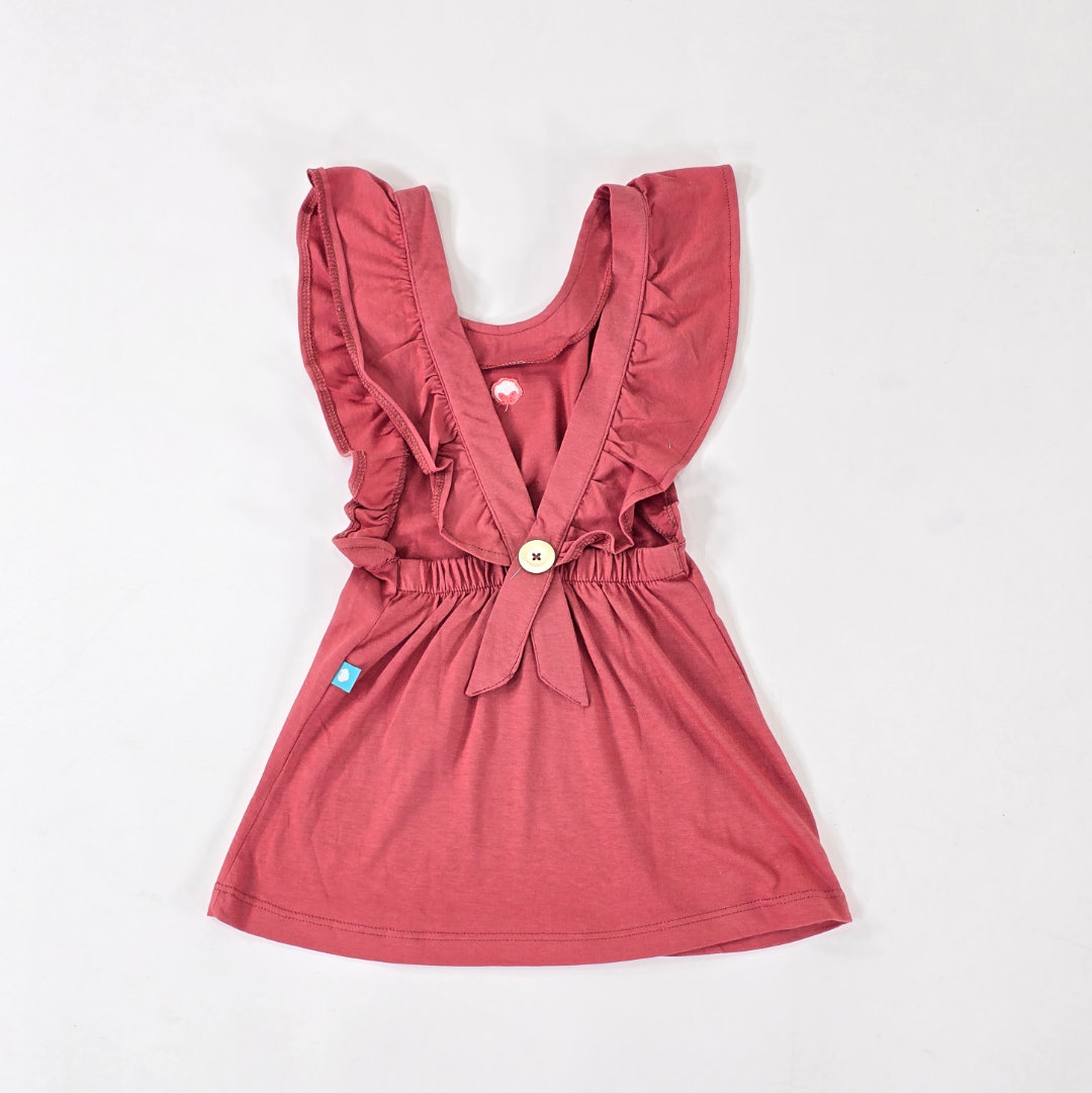VESTIDO SIN MANGAS CON ESPALDA CRUZADA, VUELOS Y BOTÓN COMO DETALLE. ELÁSTICO EN LA PARTE TRASERA PARA MAYOR COMODIDAD. COLORES: BORDÓ MELANGE Y VERDE MENTA MELANGE. TALLES DEL 1 AL 4. LA MODELO TIENE 2 AÑOS Y USA TALLE 3