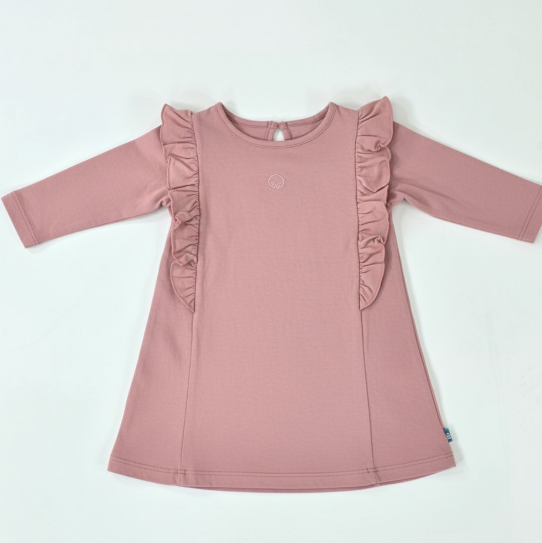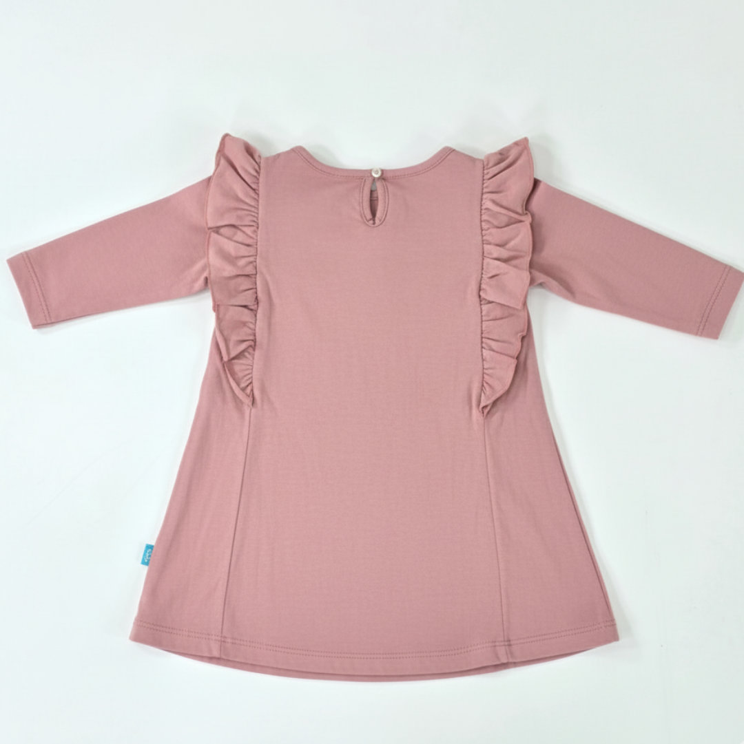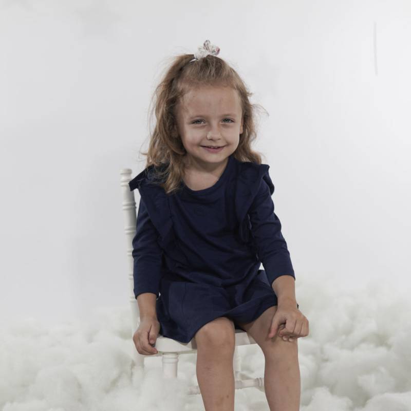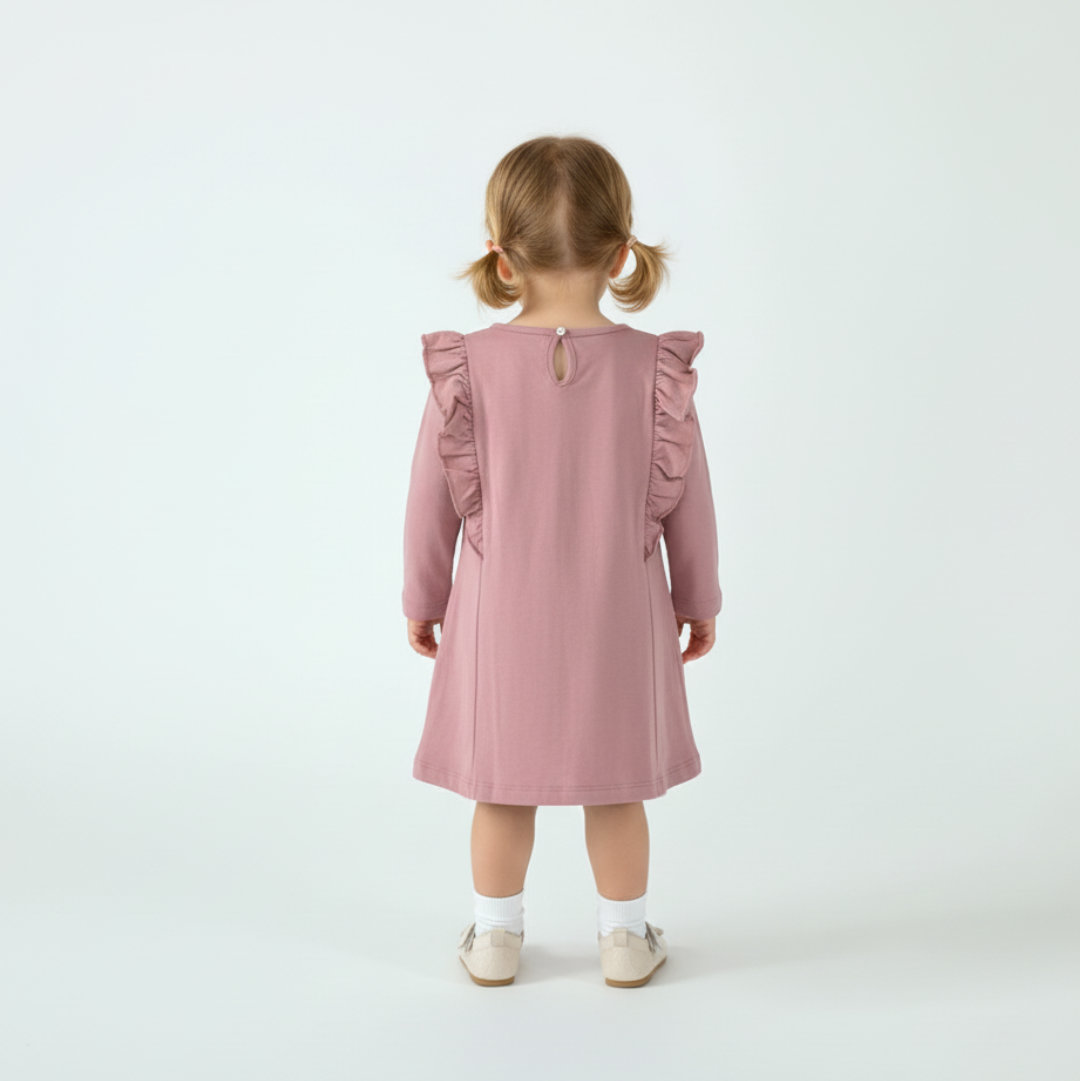 VESTIDO MANGA LARGA 100% ALGODÓN, CON VUELOS EN HOMBROS, GOTA Y BOTÓN EN ESPALDA. BORDADO EN PECHO. SUAVE, LIVIANO Y CÓMODO. DISPONIBLE DEL TALLE 1 AL 4. MODELO: TALLE 3, MIDE 60?CM Y PESA 13?KG APROX.